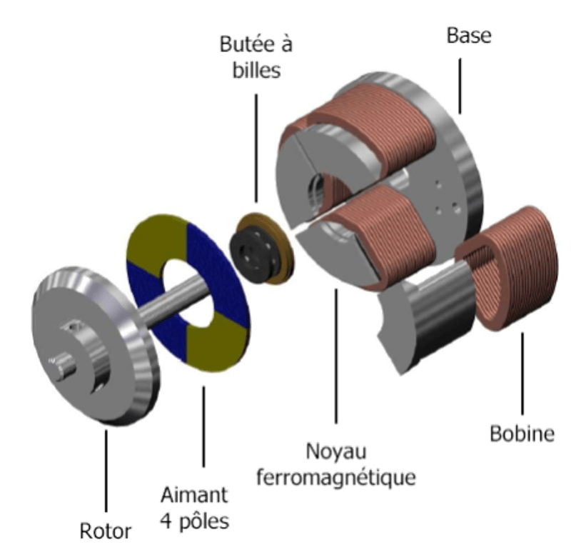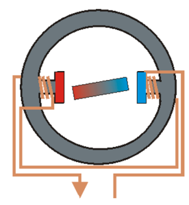 un rotor à aimant permanent soumis au champ magnétique d’une bobine parcourue par un courant est soumis à une force électromagnétique.