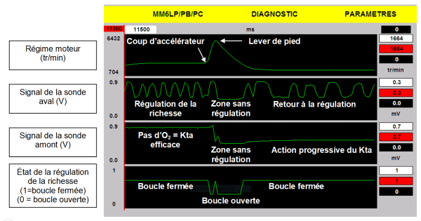 • le signal sur l ’amont varie entre pauvre (0,1V) et riche (0,9V) environ, au rythme de la régulation de richesse.