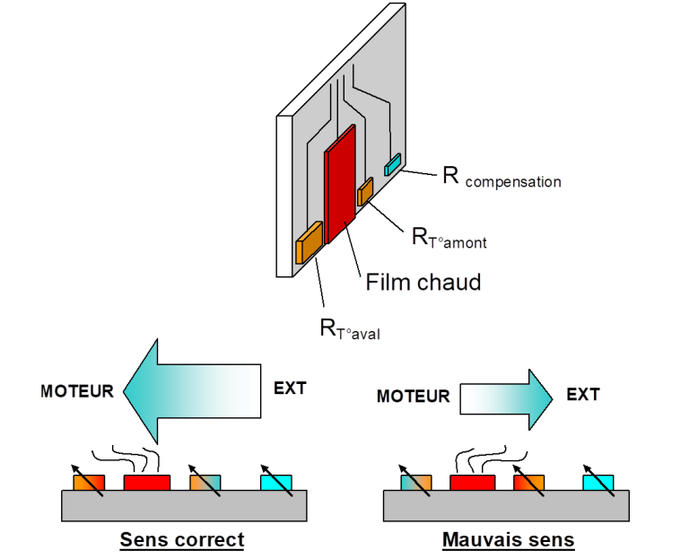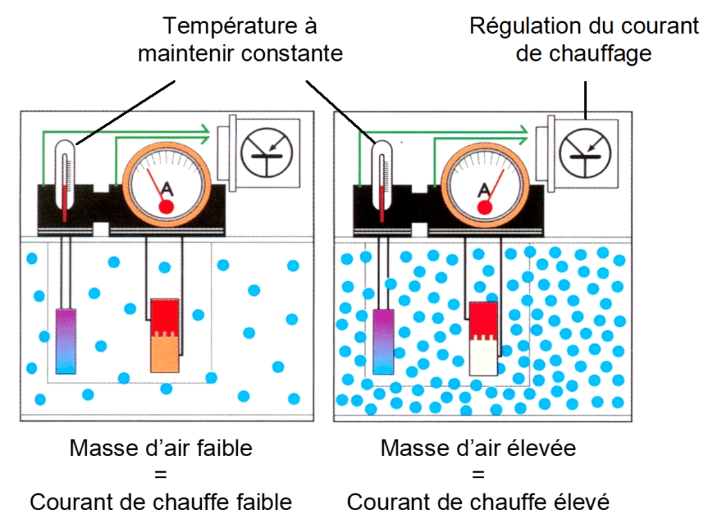le courant nĂ©cessaire pour maintenir le film chauffĂ© Ă  une tempĂ©rature fixe est proportionnel Ă  la masse d’air qui le refroidit.